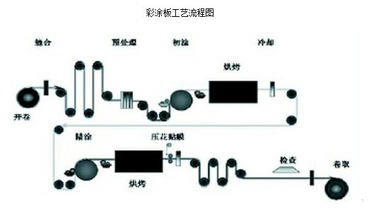 常见的二涂二烘型连续彩色涂层机组工艺流程主要生产工序为:开卷→预处理→涂敷→烘烤→后处理→卷取。