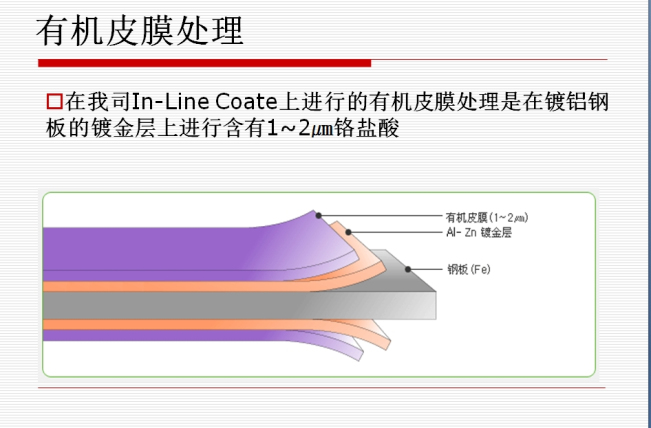 ZINCALUME® steel (镀铝锌板)的表面涂有特殊的树脂保护膜,它具有耐指纹的功效,并可减少压板过程中钢板表面的磨损;同时,还可以用来防止施工过程中因汗手,潮气,靴子等在钢板表面产生污渍,使我们的产品在安装前后都保持良好的外观效果。