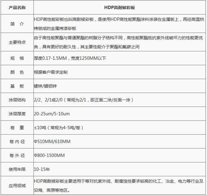 | HDP高耐候彩涂主要特点: | |||||||
