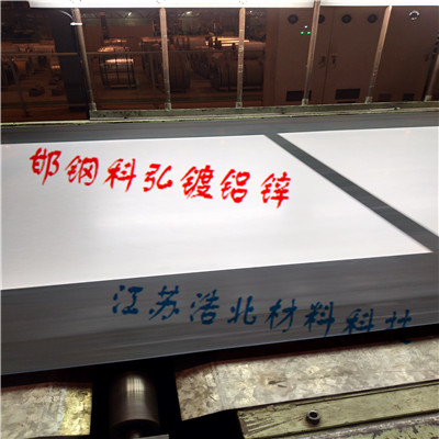 热浸镀铝锌是以冷板经过处理后,钢厂通过高端的热浸镀技术,在冷板双面表面镀一定厚度及重量的铝锌合金,其各成份含量为标准的:含铝55%,含锌43.5%、含硅1.5%。