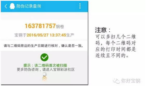 宝钢彩涂板是目前国内许多重点工程的首选材料,广大设计院和业主都积极推荐和选用宝钢彩涂板。为了回馈大家的“信赖”,宝钢从2002年开始不断升级防伪手段。在2016年,宝钢彩涂板率先应用高速数码喷印技术,在彩涂钢板生产的同时,钢板背面间断喷印唯一的加密二维码和卷号、生产时间等信息。加密二维码只有宝钢可以解析。