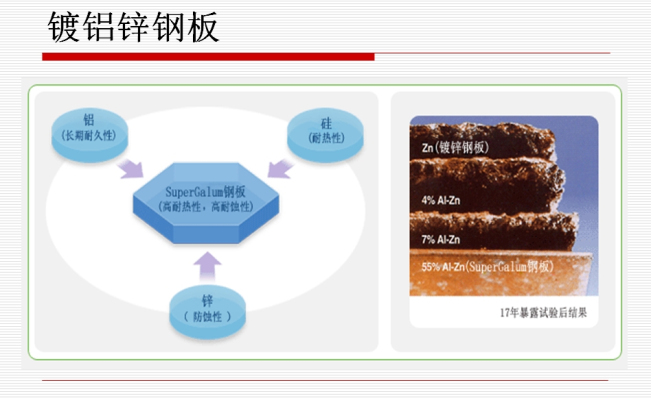 金属镀层保护钢板基板不被腐蚀的方法基本有两种,即牺牲性保护和钝化保护。ZINCALUME® steel (镀铝锌板)由于其合金镀层中既含有锌又含有铝,所以除了锌可以提供牺牲性保护以外,铝元素还提供了钝化保护。铝在空气中极易氧化,形成的AL2O3成是一层极其致密的保护膜,可以隔绝空气中的氧气,水及其它腐蚀性物质接触到钢板表面,起到抗腐蚀的作用。